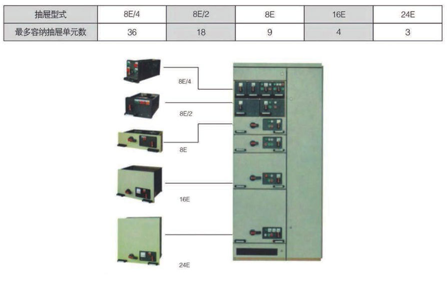 6、五種標準尺寸的抽屜,一般有 16個二次隔離觸頭引出,如果需要,除8E/4外, 其他四種抽屜可增加到32個。